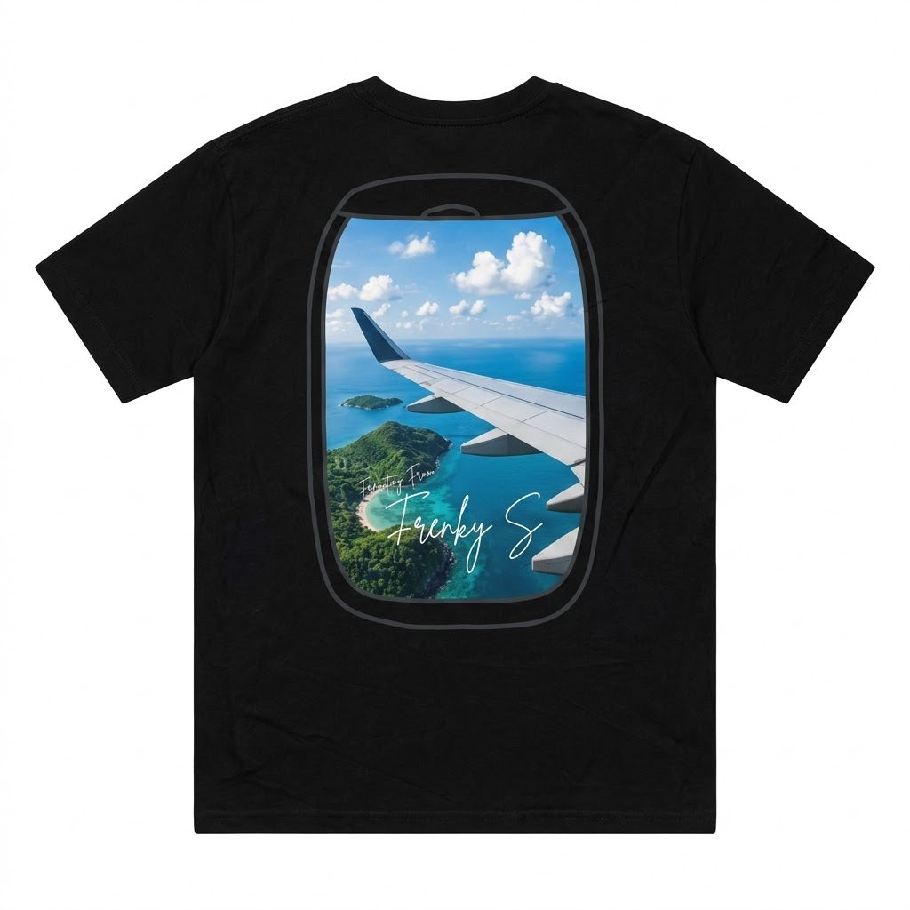 De echte eyecatcher? De rugprint. Op de achterkant kijk je door een vliegtuigraampje naar een tropisch uitzicht: Koh Samui. Een prachtig eiland, gevangen in één beeld. Subtiel vanaf de voorkant, maar zodra je je omdraait vertelt dit shirt precies waar jouw hoofd al is: zon, zee en vrijheid.