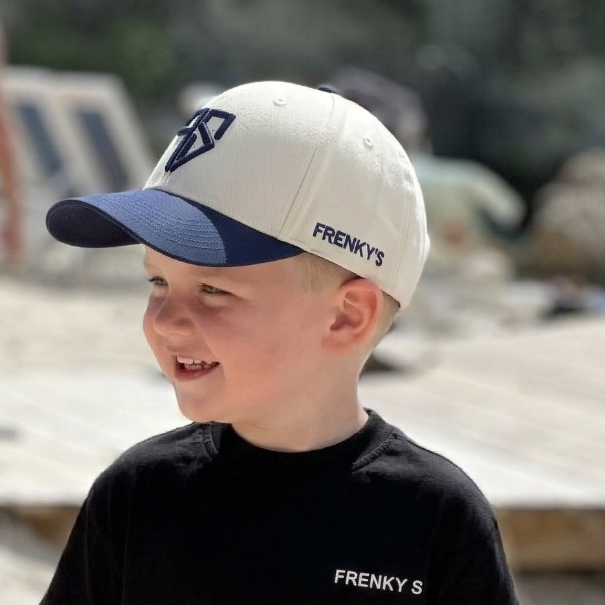 Klein formaat, grote uitstraling. De baseball snapback pet voor kids van Frenky S is dé finishing touch voor jonge trendsetters. Deze uitvoering in crème met blauwe klep en blauwe details past perfect in de trend van dit jaar: colour block petten. Fris, sportief en super makkelijk te combineren met elke outfit — van een T-shirt en short tot een hoodie op koelere dagen.