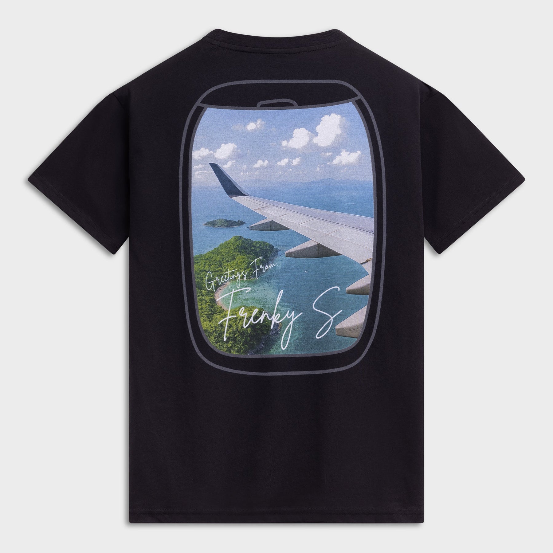De echte eyecatcher? De rugprint. Op de achterkant kijk je door een vliegtuigraampje naar een tropisch uitzicht: Koh Samui. Een prachtig eiland, gevangen in één beeld. Subtiel vanaf de voorkant, maar zodra je je omdraait vertelt dit shirt precies waar jouw hoofd al is: zon, zee en vrijheid.
